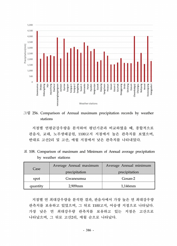 386 그림 256. Comparison of Annual maximum precipitation records by weather stations 지점별 연평균강우량을 분석하여 평년기준과 비교하였을 때, 종합적으로 관음사, 교래, 노루생태공원, 1100고지 지점에서 높은 관측치를 보였으며, 반대로 고산2리 및 고산, 애월 지점에서 낮은 관측치를 나타내었다. Case Average Annual maximum precipitation Average Annual minimum precipitation spot Gwaneumsa Gosan-2 quantity 2,909mm 1,146mm 표 108. Comparison of maximum and Minimum of Annual average precipitatio...