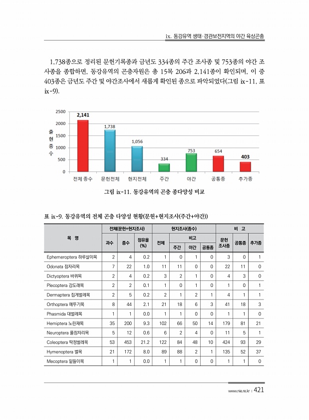 ix. 동강유역 생태·경관보전지역의 야간 육상곤충 www.nie.re.kr ?421 1,738종으로 정리된 문헌기록종과 금년도 334종의 주간 조사종 및 753종의 야간 조 사종을 종합하면, 동강유역의 곤충자원은 총 15목 206과 2,141종이 확인되며, 이 중 403종은 금년도 주간 및 야간조사에서 새롭게 확인된 종으로 파악되었다 그림 ⅸ-11, 표 ⅸ-9 그림 ⅸ-11. 동강유역의 곤충 종다양성 비교 목 명 전체 문헌+현지조사 현지조사 종수 비 고 과수 종수 점유율 % 전체 비고 문헌 주간 야간 공통종 조사종 공통종 추가종 Ephemeroptera 하루살이목 2 4 0.2 1 0 1 0 3 0 1 Odonata 잠자리목 7 22 1.0 11 11 0 0 22 11 0 Dictyoptera 바퀴목 2 4...