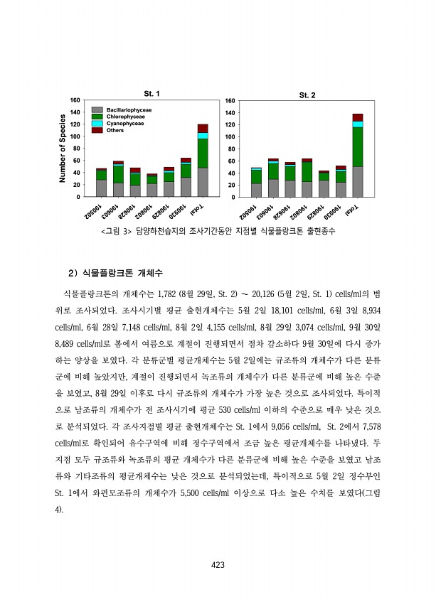 423 190502 190603 190628 190802 190829 190930 Total Number of Species 0 20 40 60 80 100 120 140 160 190502 190603 190628 190802 190829 190930 Total 0 20 40 60 80 100 120 140 160 Bacillariophyceae Chlorophyceae Cyanophyceae Others St. 1 St. 2 그림 3 담양하천습지의 조사기간동안 지점별 식물플랑크톤 출현종수 2 식물플랑크톤 개체수 식물플랑크톤의 개체수는 1,782 8월 29일, St. 2 ∼ 20,126 5월 2일, St. 1 cells/ml의 범 위로 조사되었다. 조사시기별 평균 출현개체수는 5월 2일 18,101 cel...