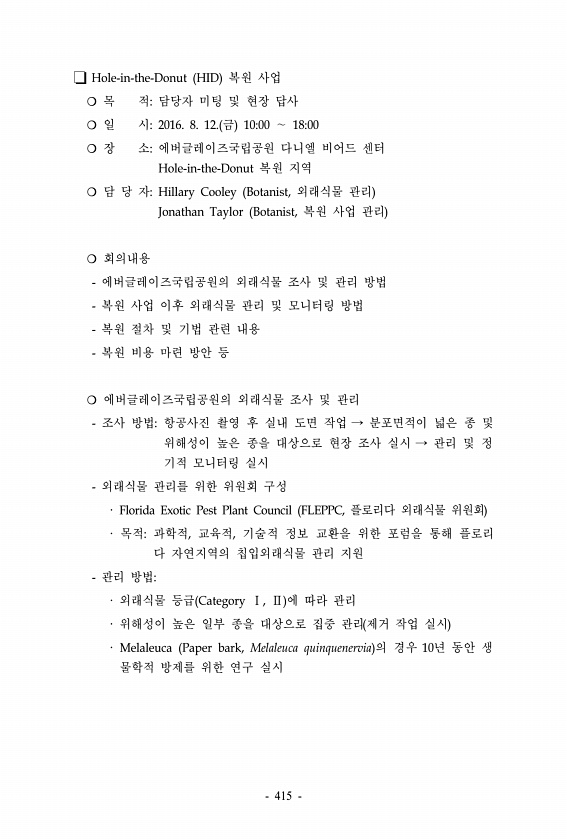 Hole-in-the-Donut HID 복원 사업 ? 목 적담당자 미팅 및 현장 답사 ? 일 시2016. 8. 12. 금 1000 ∼ 1800 ? 장 소에버글레이즈국립공원 다니엘 비어드 센터 Hole-in-the-Donut 복원 지역 ? 담 당 자Hillary Cooley Botanist, 외래식물 관리 Jonathan Taylor Botanist, 복원 사업 관리 ? 회의내용 에버글레이즈국립공원의 외래식물 조사 및 관리 방법 복원 사업 이후 외래식물 관리 및 모니터링 방법 복원 절차 및 기법 관련 내용 복원 비용 마련 방안 등 ? 에버글레이즈국립공원의 외래식물 조사 및 관리 조사 방법항공사진 촬영 후 실내 도면 작업 → 분포면적이 넓은 종 및 위해성이 높은 종을 대상으로 현장 조사 실시 → 관리 및 정 기...