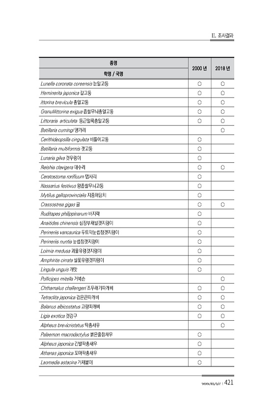 II. 조사결과 www.nie.re.kr ?421 종명 2000 년 2018 년 학명 국명 Lunella coronata coreensis 눈알고둥 ○ ○ Heminerita japonica 갈고둥 ○ ○ ittorina brevicula 총알고둥 ○ ○ Granulilittorina exigua 좁쌀무늬총알고둥 ○ ○ Littoraria articulata 둥근얼룩총알고둥 ○ ○ Batillaria cumingi 댕가리 ○ Cerithideopsilla cingulata 비틀이고둥 ○ Batillaria multiformis 갯고둥 ○ Lunaria gilva 갯우렁이 ○ Reishia clavigera 대수리 ○ ○ Ceratostoma rorifluum 맵사리 ○ Nassarius festivus 왕좁...