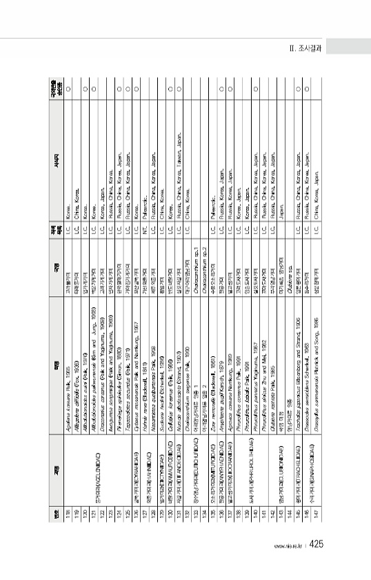 www ·nie·re·kr ? 425 번호 과명 학명 국명 적색 목록 서식지 국외반출 승인종 118 풀거미과 AGELENIDAE Agelena koreana Paik, 1965 고려풀거미 LC. Korea. ○ 119 Allagelena difficilis Fox, 1936 타래풀거미 LC. China, Korea. 120 Alloclubionoides euini Paik, 1976 입가게거미 LC. Korea. ○ 121 Alloclubionoides paikwunensis Kim and Jung, 1993 백운가게거미 LC. Korea. ○ 122 Draconarius coreanus Paik and Yaginuma, 1969 고려가게거미 LC. Korea, Japan. 123 Iwogumoa songm...