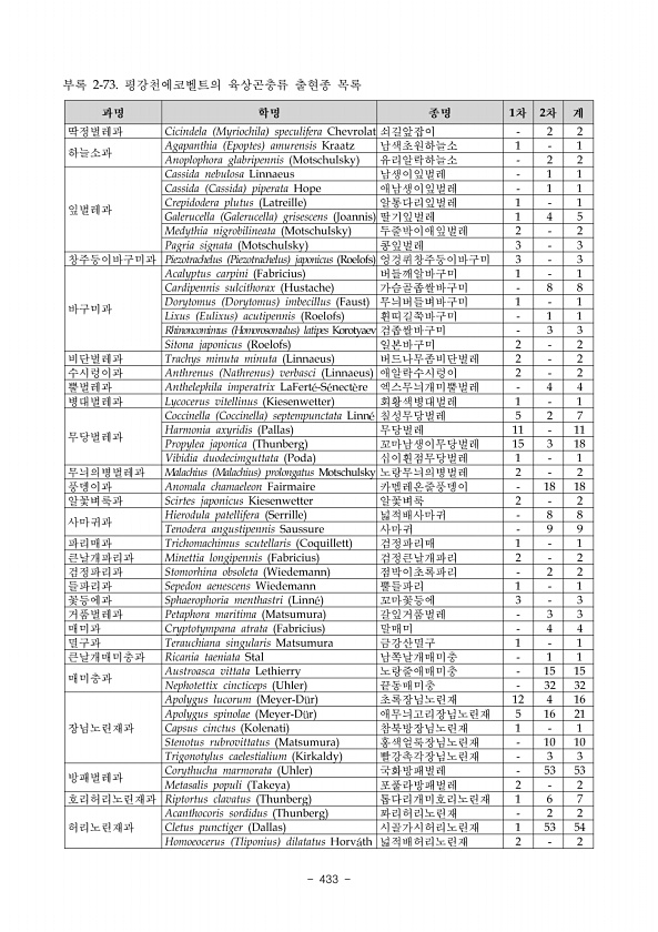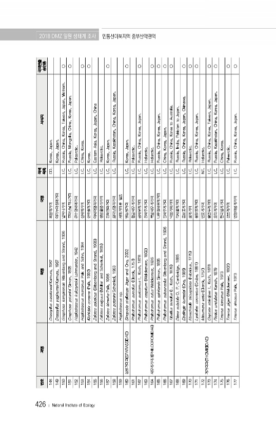 426 ? National Institute of Ecology 번호 과명 학명 국명 적색 목록 서식지 국외반출 승인종 148 Drassyllus sasakawai Kamura, 1987 뫼참매거미 DD. Korea, Japan. 149 Drassyllus yaginumai Kamura, 1987 야기누마참매거미 Korea, Japan. 150 Gnaphosa kompirensis B?senberg and Strand, 1906 넓적니거미 LC. Russia, China, Korea, Taiwan, Japan, Vietnam. ○ 151 Gnaphosa potanini Simon, 1895 포타닌넓적니거미 LC. Russia, Mongolia, China, Korea, Japan. ○ 152 Haplodra...
