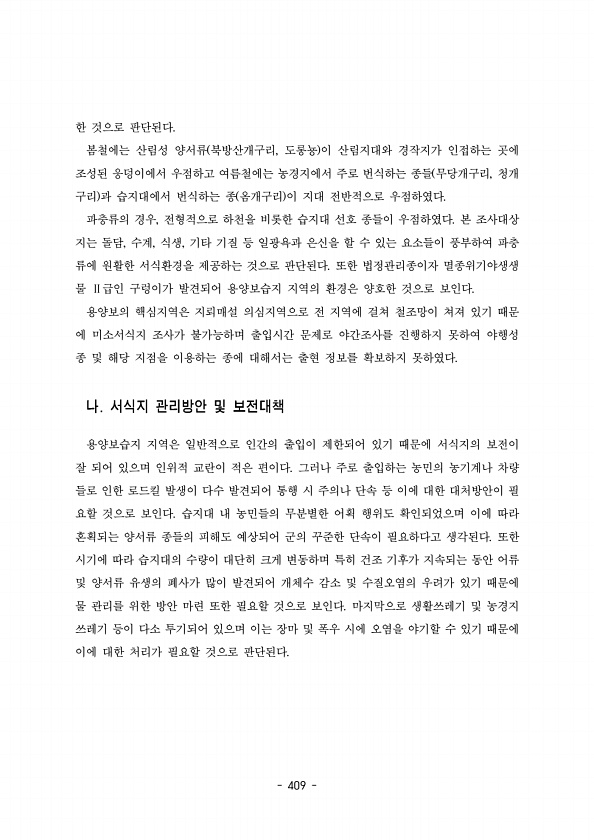 409 한 것으로 판단된다. 봄철에는 산림성 양서류 북방산개구리 도롱뇽 이 산림지대와 경작지가 인접하는 곳에 , 조성된 웅덩이에서 우점하고 여름철에는 농경지에서 주로 번식하는 종들 무당개구리 청개 , 구리 과 습지대에서 번식하는 종 옴개구리 이 지대 전반적으로 우점하였다 파충류의 경우 전형적으로 하천을 비롯한 습지대 선호 종들이 우점하였다 본 조사대상 , 지는 돌담 수계 식생 기타 기질 등 일광욕과 은신을 할 수 있는 요소들이 풍부하여 파충 , , , 류에 원활한 서식환경을 제공하는 것으로 판단된다 또한 법정관리종이자 멸종위기야생생 물 급인 구렁이가 발견되어 Ⅱ 용양보습지 지역의 환경은 양호한 것으로 보인다. 용양보의 핵심지역은 지뢰매설 의심지역으로 전 지역에 걸쳐 철조망이 쳐져 있기 때문 에 미소서식지 조...