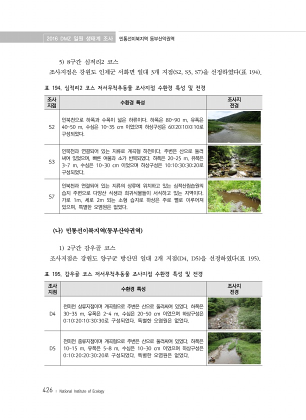2016 DMZ 일원 생태계 조사 민통선이북지역 동부산악권역 426 ? National Institute of Ecology 5 8구간 심적리2 코스 조사지점은 강원도 인제군 서화면 일대 3개 지점 S2, S3, S7 을 선정하였다 표 194 조사 지점 수환경 특성 조사지 전경 S2 인북천으로 하폭과 수폭이 넓은 하류이다. 하폭은 8090 m, 유폭은 4050 m, 수심은 1035 cm 이었으며 하상구성은 602010010로 구성되었다. S3 인북천과 연결되어 있는 지류로 계곡형 하천이다. 주변은 산으로 둘러 싸여 있었으며, 빠른 여울과 소가 반복되었다. 하폭은 2025 m, 유폭은 37 m, 수심은 1030 cm 이었으며 하상구성은 1010303020로 구성되었다. S7 인북천과 연결되어 있는 지류의 상류...