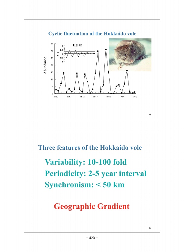 Variability10-100 fold Periodicity2-5 year interval Synchronism50 km Geographic Gradient 8 Three features of the Hokkaido vole 1962 1967 1972 1977 1982 1987 1992 5 0 10 15 20 25 30 35 -1 -0.5 0 0.5 1 AFC Heian Abundance 7 Cyclic fluctuation of the Hokkaido vole 420