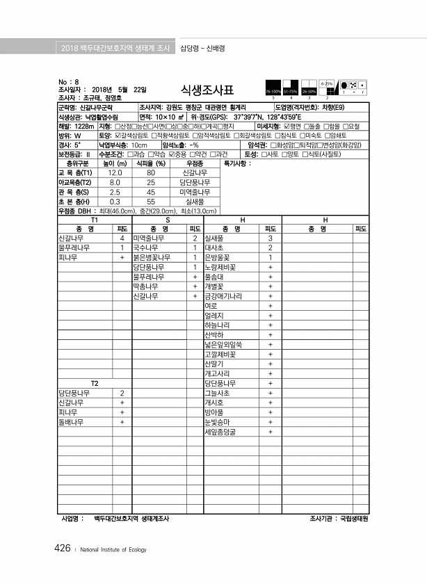2018 백두대간보호지역 생태계 조사 삽당령 신배령 426 ? National Institute of Ecology No 8 조사일자 2018년 5월 22일 조사자 조규태, 정영호 식생조사표 군락명신갈나무군락 조사지역강원도 평창군 대관령면 횡계리 도엽명 격자번호 차향 E9 식생상관낙엽활엽수림 면적10×10 ㎡ 위·경도 GPS 37°397N, 128°4359E 해발1228m 지형□산정□능선□사면 □상□중□하 □계곡□평지 미세지형?평면 □돌출 □함몰 □요철 방위W 토양?갈색삼림토 □적황색삼림토 □암적색삼림토 □회갈색삼림토 □침식토 □미숙토 □암쇄토 경사5° 낙엽부식층10cm 암석노출-% 암석권□화성암□퇴적암□변성암 화강암 보전등급Ⅱ 수분조건□과습 □약습 ?중용 □약건 □과건 토성□사토 □양토 □식토 사질토 층위...