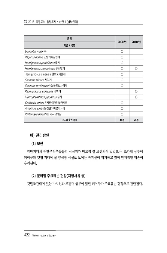 2018 특정도서 정밀조사 신안 1 남부권역 422 ? National Institute of Ecology 1 암반지대의 해안무척추동물의 서식지가 비교적 잘 보전되어 있었으나, 조간대 상부에 폐어구와 갯벌 지대에 굴 양식장 시설로 보이는 바지선이 위치하고 있어 인위적인 훼손이 우려된다. 2 갯벌조간대에 있는 바지선과 조간대 상부에 있던 폐어구가 주요훼손 현황으로 판단된다. 종명 2000 년 2018 년 학명 국명 Upogebia major 쏙 ○ Pagurus dubius 긴발가락참집게 ○ Hemigrapsus penicillatus 풀게 ○ Hemigrapsus sanguineus 무늬발게 ○ ○ Hemigrapsus sinensis 털보꼬마풀게 ○ Sesarma pictum 사각게 ○ Sesarma e...