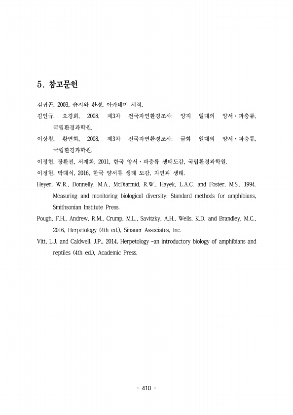 410 김귀곤 습지와 환경 아카데미 서적 , 2003, , 김인규 오경희 , , 2008, 3 제 차 전국자연환경조사 양지 일대의 양서 파충류 · , 국립환경과학원. 이상철 황연화 , , 2008, 3 제 차 전국자연환경조사 금화 일대의 양서 파충류 · , 국립환경과학원. 이정현 장환진 서재화 한국 양서 파충류 생태도감 국립환경과학원 , , , 2011, · , 이정현 박대식 한국 양서류 생태 도감 자연과 생태 , , 2016, , Heyer, W.R., Donnelly, M.A., McDiarmid, R.W., Hayek, L.A.C. and Foster, M.S., 1994. Measuring and monitoring biological diversityStandard methods for amphib...