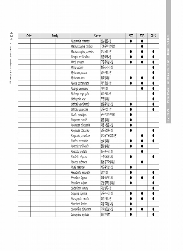 424 Order Family Species 2009 2013 2015 Naganoella timandra 신부짤름나방 ● ● Macdunnoughia confusa 국화은무늬밤나방 ● Macdunnoughia purissima 은무늬밤나방 ● ● ● Metopta rectifasciata 흰줄태극나방 ● ● ● Mocis annetta 구름무늬밤나방 ● ● ● Moma alpium 높은산저녁나방 ● Mythimna postica 갈색점밤나방 ● Mythimna turca 쌍띠밤나방 ● ● ● Naenia contaminata 더러운밤나방 ● ● ● Naranga aenescens 벼애나방 ● ● Niphonyx segregata 엉겅퀴밤나방 ● Orthogonia sera 모진밤나방 ● Orthosia c...
