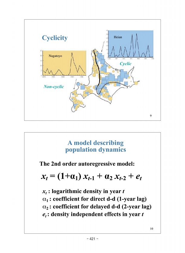 10 A model describing population dynamics The 2nd order autoregressive modelxt = 1+α1 xt-1 + α2 xt-2 + et x t logarithmic density in year t α1 coefficient for direct d-d 1-year lag α2 coefficient for delayed d-d 2-year lag e t density independent effects in year t Heian Nagatoyo Non-cyclic Cyclic 9 Cyclicity 421