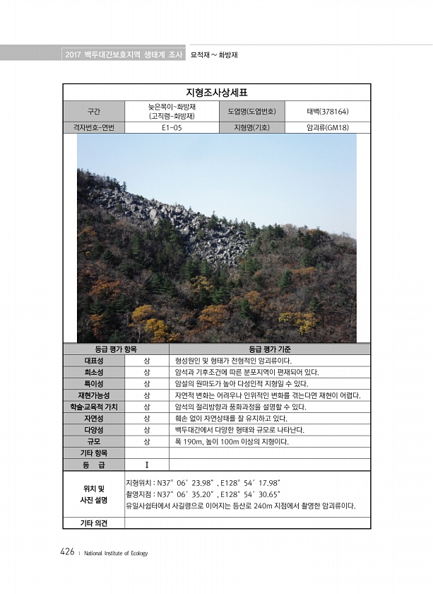 2017 백두대간보호지역 생태계 조사 묘적재 화방재 426 ? National Institute of Ecology 지형조사상세표 구간 늦은목이화방재 고직령-화방재 도엽명 도엽번호 태백 378164 격자번호-연번 E1-05 지형명 기호 암괴류 GM18 등급 평가 항목 등급 평가 기준 대표성 상 형성원인 및 형태가 전형적인 암괴류이다. 희소성 상 암석과 기후조건에 따른 분포지역이 편재되어 있다. 특이성 상 암설의 원마도가 높아 다성인적 지형일 수 있다. 재현가능성 상 자연적 변화는 어려우나 인위적인 변화를 겪는다면 재현이 어렵다. 학술?교육적 가치 상 암석의 절리방향과 풍화과정을 설명할 수 있다. 자연성 상 훼손 없이 자연상태를 잘 유지하고 있다. 다양성 상 백두대간에서 다양한 형태와 규모로 나타난다. 규모 ...