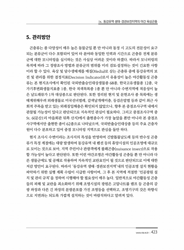 ix. 동강유역 생태·경관보전지역의 야간 육상곤충 www.nie.re.kr ?423 5. 곤충류는 종 다양성이 매우 높은 동물군일 뿐 만 아니라 동정 시 고도의 전문성이 요구 되는 분류군이 다수 포함되어 있어 타 분야와 동일한 인력과 시간으로 곤충류 전체 분류 군에 대한 모니터링을 실시하는 것은 사실상 어려운 것이라 하겠다. 따라서 모니터링의 목적에 따라 그 정량조사 방법과 분류군의 범위를 미리 검토?설정하는 것이 긴요한 사항 이라 할 수 있다. 육상 및 담수생태계를 매질 Media 로 삼는 곤충류 중에 동강유역의 보 전 및 관리를 위한 결정지표 Decision Indicator 로서 유용성이 높은 야간활동성 곤충 류는 본 현지조사에서 확인된 국외반출승인대상생물종 68종, 한국고유생물종 12종, 국 가기후변...