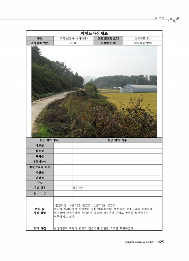 Ⅲ. 부 록 National Institute of EcologyⅠ425 지형조사상세표 구간 백학산 큰재-신의터재 도엽명 도엽번호 모서 367124 격자번호-연번 E3-08 지형명 기호 기타 훼손지역 등급 평가 항목 등급 평가 기준 대표성 희소성 특이성 재현가능성 학술?교육적 가치 자연성 다양성 규모 기타 항목 훼손지역 등 급 위치 및 사진 설명 촬영지점 N36° 22′ 07.21″ , E127° 58′ 57.25″ 지기재-신의터재로 이어지는 등산로 660m 에는 백두대간 보호구역과 농경지가 인접하여 완충구역이 존재하지 않으며 핵심구역 내에도 농업적 토지이용이 이루어지고 있다. 기타 의견 촬영지점과 지형의 위치가 인접하여 동일한 좌표를부여하였다.
