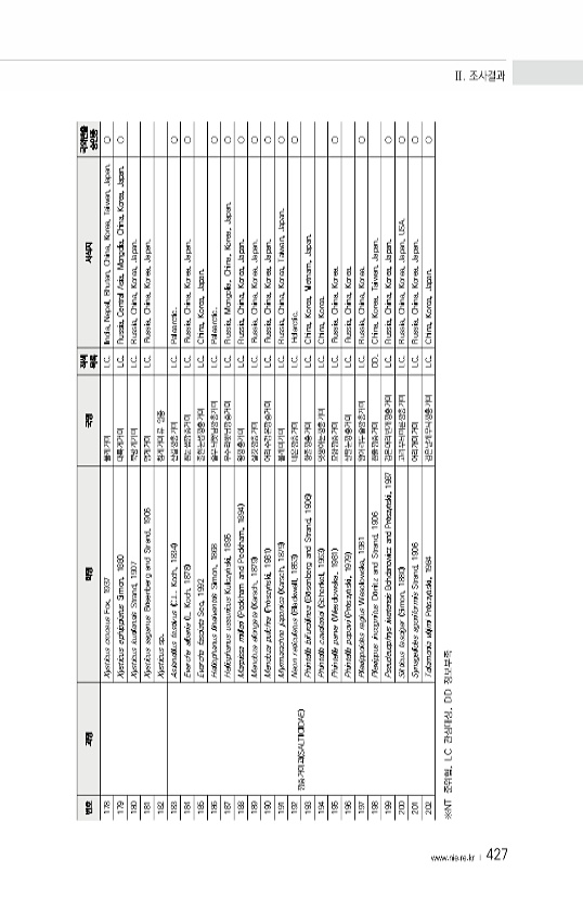 www ·nie·re·kr ? 427 번호 과명 학명 국명 적색 목록 서식지 국외반출 승인종 178 Xysticus croceus Fox, 1937 풀게거미 LC. India, Nepal, Bhutan, China, Korea, Taiwan, Japan. ○ 179 Xysticus ephippiatus Simon, 1880 대륙게거미 LC. Russia, Central Asia, Mongolia, China, Korea, Japan. ○ 180 Xysticus kurilensis Strand, 1907 북방게거미 LC. Russia, China, Korea, Japan. 181 Xysticus saganus B?senberg and Strand, 1906 멍게거미 LC. Russia, China, Korea...