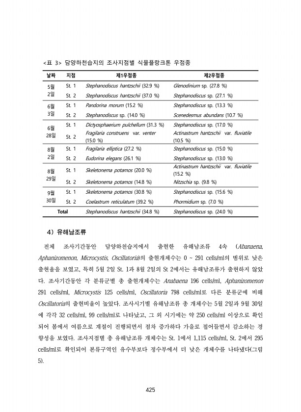 425 날짜 지점 제1우점종 제2우점종 5월 2일 St. 1 Stephanodiscus hantzschii 32.9 % Glenodinium sp. 27.8 % St. 2 Stephanodiscus hantzschii 37.0 % Stephanodiscus sp. 27.1 % 6월 3일 St. 1 Pandorina morum 15.2 % Stephanodiscus sp. 13.3 % St. 2 Stephanodiscus sp. 14.0 % Scenedesmus abundans 10.7 % 6월 28일 St. 1 Dictyosphaerium pulchellum 31.3 % Stephanodiscus sp. 17.0 % St. 2 Fragilaria construens var. venter 15.0 % Acti...