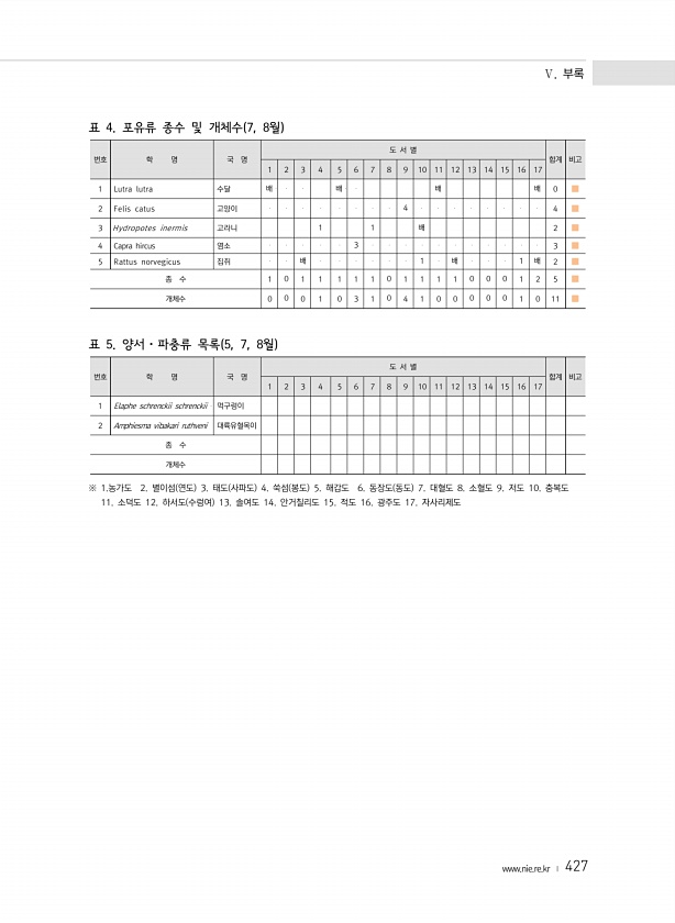 Ⅴ. 부록 www.nie.re.kr ? 427 표 4. 포유류 종수 및 개체수 7, 8월 번호 학 명 국 명 도 서 별 합계 비고 1 2 3 4 5 6 7 8 9 10 11 12 13 14 15 16 17 1 Lutra lutra 수달 배 배 배 배 0 ■ 2 Felis catus 고양이 4 4 ■ 3 Hydropotes inermis 고라니 1 1 배 2 ■ 4 Capra hircus 염소 3 3 ■ 5 Rattus norvegicus 집쥐 배 1 배 1 배 2 ■ 종 수 1 0 1 1 1 1 1 0 1 1 1 1 0 0 0 1 2 5 ...