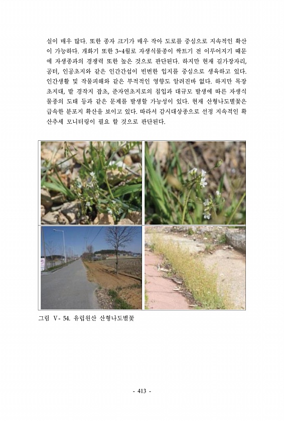 실이 매우 많다. 또한 종자 크기가 매우 작아 도로를 중심으로 지속적인 확산 이 가능하다. 개화기 또한 34월로 자생식물종이 싹트기 전 이루어지기 때문 에 자생종과의 경쟁력 또한 높은 것으로 판단된다. 하지만 현재 길가장자리, 공터, 인공초지와 같은 인간간섭이 빈번한 입지를 중심으로 생육하고 있다. 인간생활 및 작물피해와 같은 부적적인 영향도 알려진바 없다. 하지만 목장 초지대, 밭 경작지 잡초, 준자연초지로의 침입과 대규모 발생에 따른 자생식 물종의 도태 등과 같은 문제를 발생할 가능성이 있다. 현재 산형나도별꽃은 급속한 분포지 확산을 보이고 있다. 따라서 감시대상종으로 선정 지속적인 확 산추세 모니터링이 필요 할 것으로 판단된다. 그림 Ⅴ- 54. 유럽원산 산형나도별꽃 413
