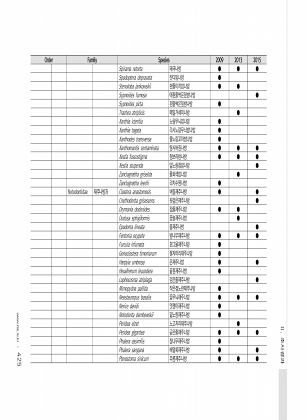 425 Order Family Species 2009 2013 2015 Spirama retorta 태극나방 ● ● ● Spodoptera depravata 잔디밤나방 ● Stenoloba jankowskii 흰줄이끼밤나방 ● ● Sypnoides fumosa 애흰줄썩은잎밤나방 ● Sypnoides picta 흰줄썩은잎밤나방 ● Trachea atriplicis 메밀거세미나방 ● Xanthia icteritia 노랑무늬밤나방 ● Xanthia togata 각시노랑무늬밤나방 ● Xanthodes transversa 줄노랑꼬마밤나방 ● Xanthomantis contaminata 탐시버짐나방 ● ● ● Xestia fuscostigma 점보라밤나방 ● ● ● Xestia stupenda 앞노랑점밤나방 ● Zan...