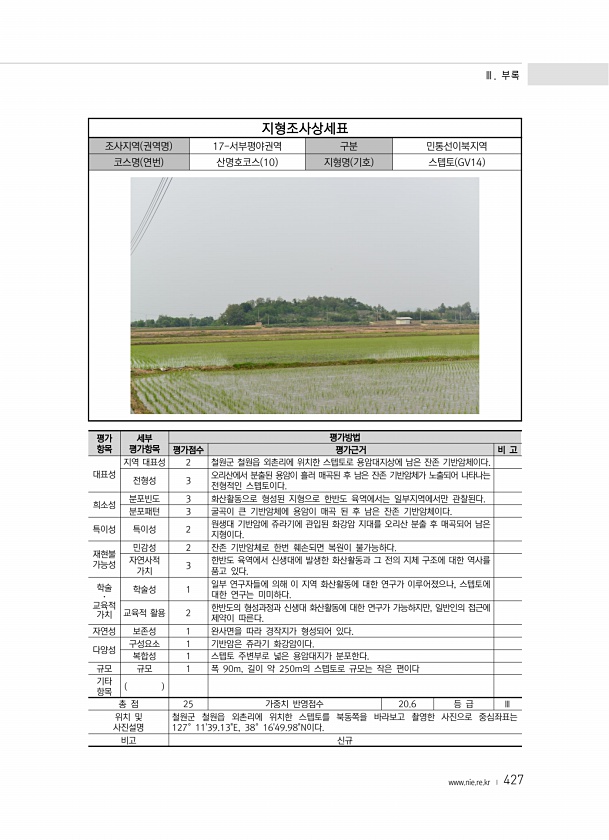 Ⅲ. 부록 www.nie.re.kr ? 427 지형조사상세표 조사지역 권역명 17-서부평야권역 구분 민통선이북지역 코스명 연번 산명호코스 10 지형명 기호 스텝토 GV14 평가 항목 세부 평가항목 평가방법 평가점수 평가근거 비 고 대표성 지역 대표성 2 철원군 철원읍 외촌리에 위치한 스텝토로 용암대지상에 남은 잔존 기반암체이다. 전형성 3 오리산에서 분출된 용암이 흘러 매곡된 후 남은 잔존 기반암체가 노출되어 나타나는 전형적인 스텝토이다. 희소성 분포빈도 3 화산활동으로 형성된 지형으로 한반도 육역에서는 일부지역에서만 관찰된다. 분포패턴 3 굴곡이 큰 기반암체에 용암이 매곡 된 후 남은 잔존 기반암체이다. 특이성 특이성 2 원생대 기반암에 쥬라기에 관입된 화강암 지대를 오리산 분출 후 매곡되어 남은 지형이다...