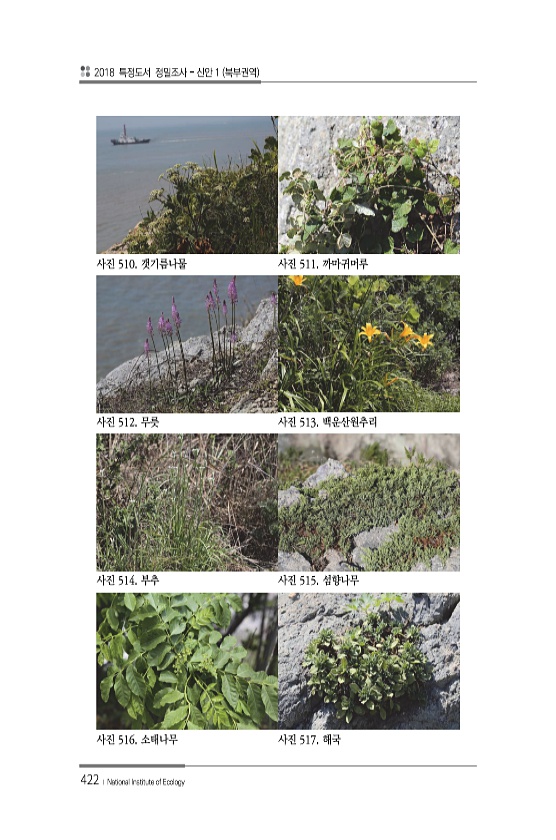 2018 특정도서 정밀조사 신안 1 북부권역 422 ? National Institute of Ecology 사진 510. 갯기름나물 사진 511. 까마귀머루 사진 512. 무릇 사진 513. 백운산원추리 사진 514. 부추 사진 515. 섬향나무 사진 516. 소태나무 사진 517.해국