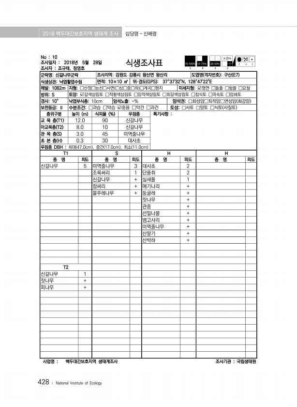2018 백두대간보호지역 생태계 조사 삽당령 신배령 428 ? National Institute of Ecology No 10 조사일자 2018년 5월 28일 조사자 조규태, 정영호 식생조사표 군락명신갈나무군락 조사지역강원도 강릉시 왕산면 왕산리 도엽명 격자번호 구산 E7 식생상관낙엽활엽수림 면적10×10 ㎡ 위·경도 GPS 37°3732N, 128°4722E 해발1082m 지형□산정□능선□사면 □상□중□하 □계곡□평지 미세지형?평면 □돌출 □함몰 □요철 방위S 토양?갈색삼림토 □적황색삼림토 □암적색삼림토 □회갈색삼림토 □침식토 □미숙토 □암쇄토 경사10° 낙엽부식층10cm 암석노출-% 암석권□화성암□퇴적암□변성암 화강암 보전등급Ⅱ 수분조건□과습 □약습 ?중용 □약건 □과건 토성□사토 □양토 □식토 사질토 ...