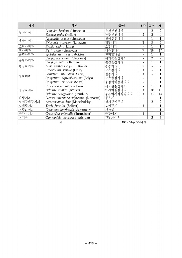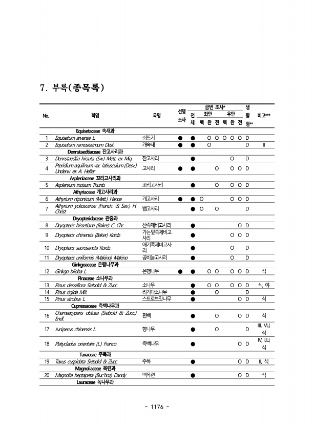 1176 7. 부록 종목록 No. 학명 국명 선행 조사 금번 조사* 생 활 형 ** 전 비고*** 체 좌안 우안 핵 완 전 핵 완 전 Equisetaceae 속새과 1 Equisetum arvense L. 쇠뜨기 ● ● O O O O O D 2 Equisetum ramosissimum Desf. 개속새 ● ● O D II Dennstaedtiaceae 잔고사리과 3 Dennstaedtia hirsuta Sw. Mett. ex Miq. 잔고사리 ● O D 4 Pteridiumaquilinumvar. latiusculum Desv. Underw. ex A. Heller 고사리 ● ● O O O D Aspleniaceae 꼬리고사리과 5 Asplenium incisum Thunb. 꼬리고사리 ● O O O D A...