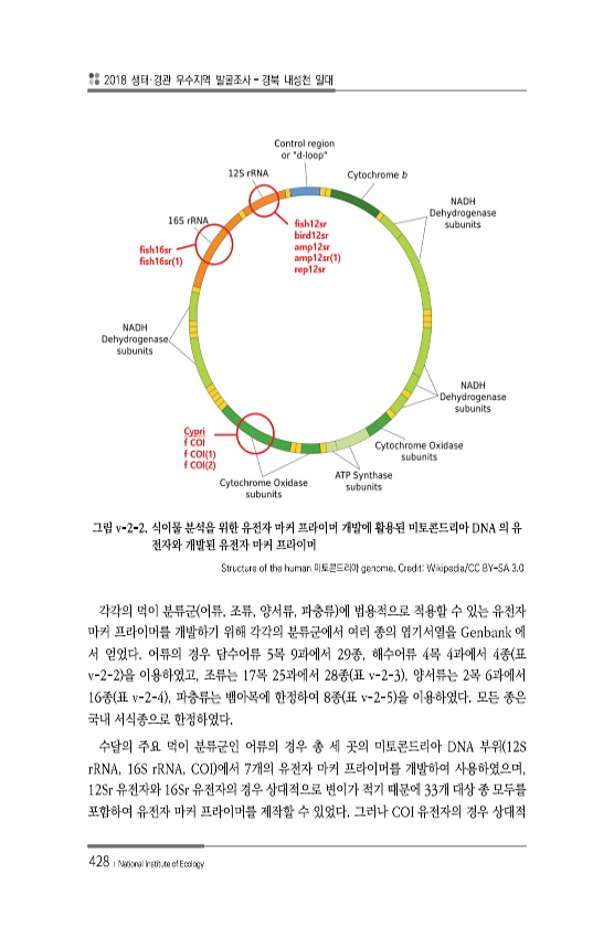 2018 생태·경관 우수지역 발굴조사 경북 내성천 일대 428 ? National Institute of Ecology 그림 v-2-2. 식이물 분석을 위한 유전자 마커 프라이머 개발에 활용된 미토콘드리아 DNA 의 유 전자와 개발된 유전자 마커 프라이머 Structure of the human 미토콘드리아 genome. CreditWikipedia/CC BY-SA 3.0 각각의 먹이 분류군 어류, 조류, 양서류, 파충류 에 범용적으로 적용할 수 있는 유전자 마커 프라이머를 개발하기 위해 각각의 분류군에서 여러 종의 염기서열을 Genbank 에 서 얻었다. 어류의 경우 담수어류 5목 9과에서 29종, 해수어류 4목 4과에서 4종 표 v-2-2 을 이용하였고, 조류는 17목 25과에서 28종 표 v-2-3 ,...