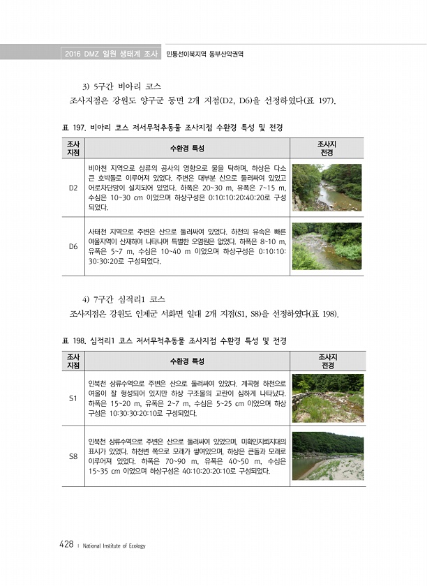 2016 DMZ 일원 생태계 조사 민통선이북지역 동부산악권역 428 ? National Institute of Ecology 3 5구간 비아리 코스 조사지점은 강원도 양구군 동면 2개 지점 D2, D6 을 선정하였다 표 197 조사 지점 수환경 특성 조사지 전경 D2 비아천 지역으로 상류의 공사의 영향으로 물을 탁하며, 하상은 다소 큰 호박돌로 이루어져 있었다. 주변은 대부분 산으로 둘러싸여 있었고 어로차단망이 설치되어 있었다. 하폭은 2030 m, 유폭은 715 m, 수심은 1030 cm 이었으며 하상구성은 01010204020로 구성 되었다. D6 사태천 지역으로 주변은 산으로 둘러싸여 있었다. 하천의 유속은 빠른 여울지역이 산재하여 나타나며 특별한 오염원은 없었다. 하폭은 810 m, 유폭은 57 m,...