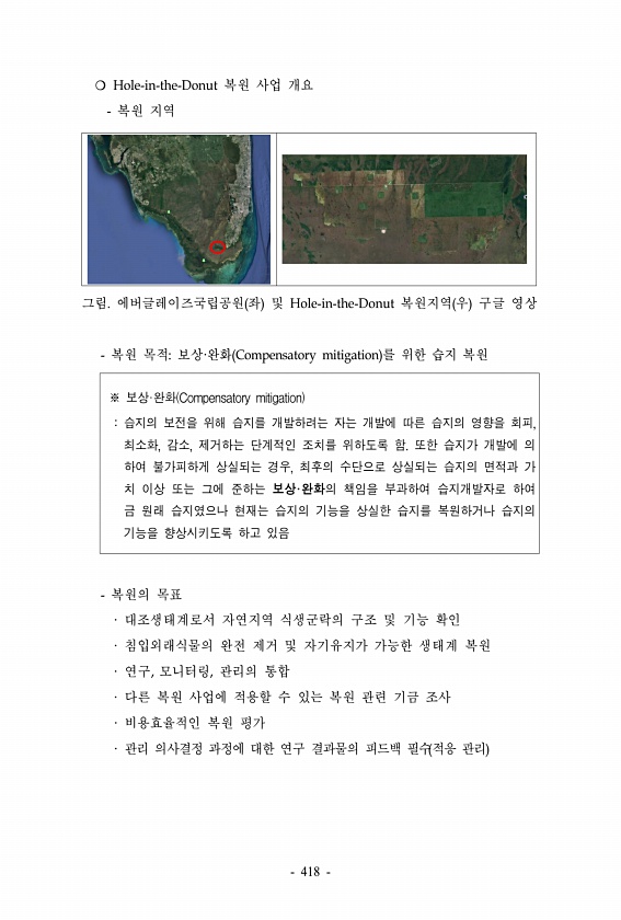 ? Hole-in-the-Donut 복원 사업 개요 복원 지역 그림. 에버글레이즈국립공원 좌 및 Hole-in-the-Donut 복원지역 우 구글 영상 복원 목적보상·완화 Compensatory mitigation 를 위한 습지 복원 ※ 보상·완화 Compensatory mitigation 습지의 보전을 위해 습지를 개발하려는 자는 개발에 따른 습지의 영향을 회피, 최소화, 감소, 제거하는 단계적인 조치를 위하도록 함. 또한 습지가 개발에 의 하여 불가피하게 상실되는 경우, 최후의 수단으로 상실되는 습지의 면적과 가 치 이상 또는 그에 준하는 보상·완화의 책임을 부과하여 습지개발자로 하여 금 원래 습지였으나 현재는 습지의 기능을 상실한 습지를 복원하거나 습지의 기능을 향상시키도록 하고 있음 복원의 목표 · ...