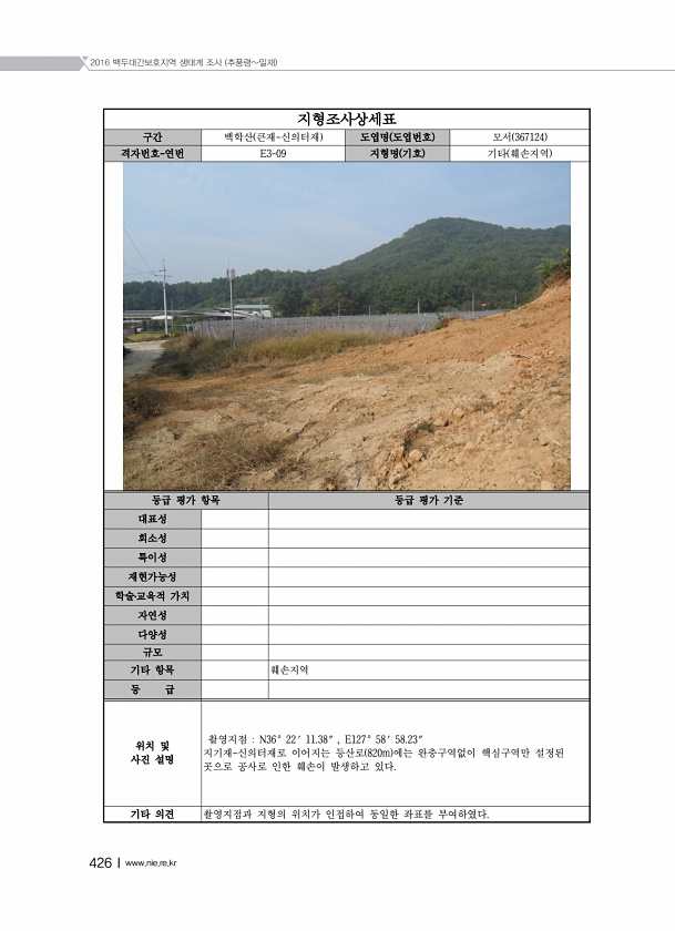 2016 백두대간보호지역 생태계 조사 추풍령밀재 426Ⅰwww.nie.re.kr 지형조사상세표 구간 백학산 큰재-신의터재 도엽명 도엽번호 모서 367124 격자번호-연번 E3-09 지형명 기호 기타 훼손지역 등급 평가 항목 등급 평가 기준 대표성 희소성 특이성 재현가능성 학술?교육적 가치 자연성 다양성 규모 기타 항목 훼손지역 등 급 위치 및 사진 설명 촬영지점 N36° 22′ 11.38″ , E127° 58′ 58.23″ 지기재-신의터재로 이어지는 등산로 820m 에는 완충구역없이 핵심구역만 설정된 곳으로 공사로 인한 훼손이 발생하고 있다. 기타 의견 촬영지점과 지형의 위치가 인접하여 동일한 좌표를부여하였다.