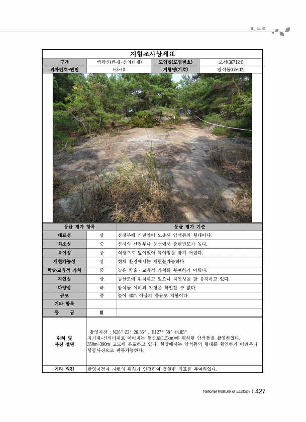 Ⅲ. 부 록 National Institute of EcologyⅠ427 지형조사상세표 구간 백학산 큰재-신의터재 도엽명 도엽번호 모서 367124 격자번호-연번 E3-10 지형명 기호 암석돔 GM02 등급 평가 항목 등급 평가 기준 대표성 상 산정부에 기반암이 노출된 암석돔의 형태이다. 희소성 중 산지의 산정부나 능선에서 출현빈도가 높다. 특이성 중 식생으로 덮여있어 특이점을 찾기 어렵다. 재현가능성 상 현재 환경에서는 재현불가능하다. 학술?교육적 가치 중 높은 학술·교육적 가치를 부여하기 어렵다. 자연성 상 등산로에 위치하고 있으나 자연성을 잘 유지하고 있다. 다양성 하 암석돔 이외의 지형은 확인할 수 없다. 규모 중 높이 40m 이상의 중규모 지형이다. 기타 항목 등 급 Ⅲ 위치 및 사진 설명 촬영지점...