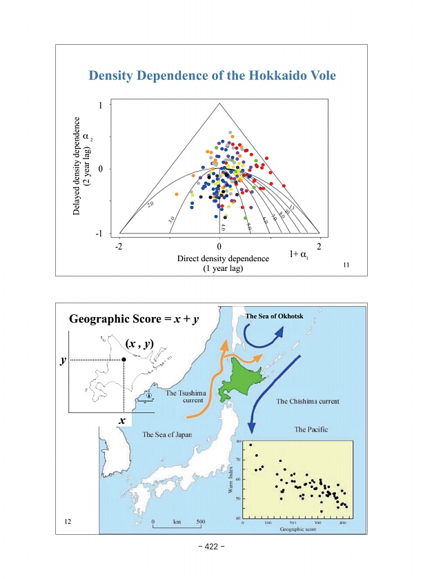 12 The Sea of Okhotsk 0 km 100 N Geographic Score = x + y x x , y y Direct density dependence 1 year lag Delayed density dependence 2 year lag 2 α 1 0 -1 -2 0 2 1+ α 1 10 13 8.0 7.0 6.0 5.0 3.0 2.0 4.0 11 Density Dependence of the Hokkaido Vole 422