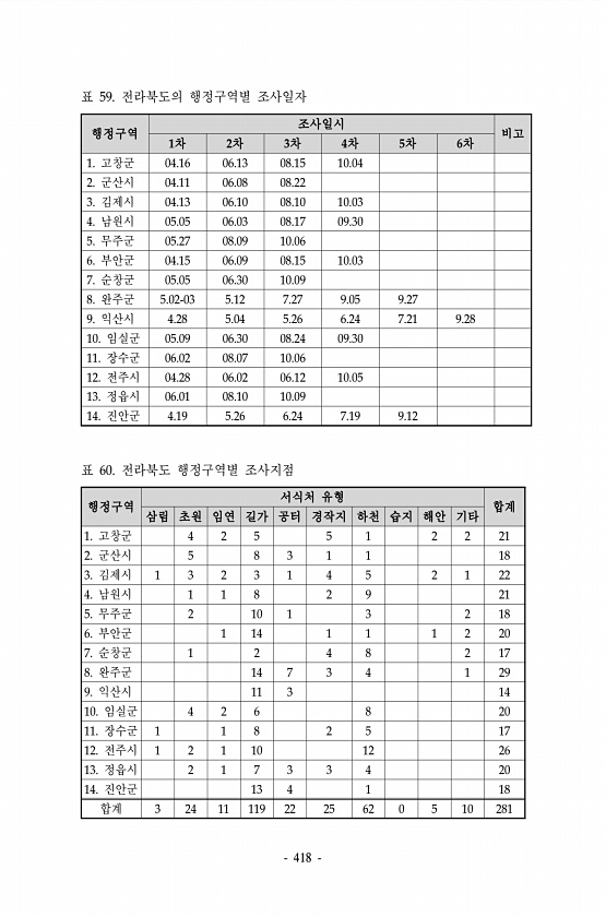 418 행정구역 조사일시 비고 1차 2차 3차 4차 5차 6차 1. 고창군 04.16 06.13 08.15 10.04 2. 군산시 04.11 06.08 08.22 3. 김제시 04.13 06.10 08.10 10.03 4. 남원시 05.05 06.03 08.17 09.30 5. 무주군 05.27 08.09 10.06 6. 부안군 04.15 06.09 08.15 10.03 7. 순창군 05.05 06.30 10.09 8. 완주군 5.02-03 5.12 7.27 9.05 9.27 9. 익산시 4.28 5.04 5.26 6.24 7.21 9.28 10. 임실군 05.09 06.30 08.24 09.30 11. 장수군 06.02 08.07 10.06 12. 전주시 04.28 06.02 06.12 10.05 13. ...