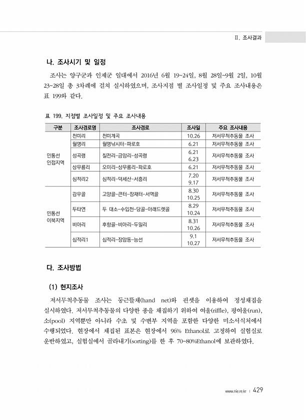 Ⅱ. 조사결과 www.nie.re.kr ? 429 나. 조사시기 및 일정 조사는 양구군과 인제군 일대에서 2016년 6월 1924일, 8월 28일9월 2일, 10월 2328일 총 3차례에 걸쳐 실시하였으며, 조사지점 별 조사일정 및 주요 조사내용은 표 199와 같다. 구분 조사경로명 조사경로 조사일 주요 조사내용 민통선 인접지역 천미리 천미계곡 10.26 저서무척추동물 조사 월명리 월명낚시터-파로호 6.21 저서무척추동물 조사 성곡령 칠전리-금암리-성곡령 6.21 6.23 저서무척추동물 조사 상무룡리 오미리-상무룡리-파로호 6.21 저서무척추동물 조사 심적리2 심적리-덕세산-서흥리 7.20 9.17 저서무척추동물 조사 민통선 이북지역 감우골 고양골-큰터-장재터-서역골 8.30 10.25 저서무척추동물 조사 ...