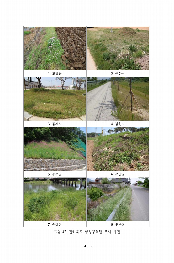 419 1. 고창군 2. 군산시 3. 김제시 4. 남원시 5. 무주군 6. 부안군 7. 순창군 8. 완주군 그림 42. 전라북도 행정구역별 조사사진