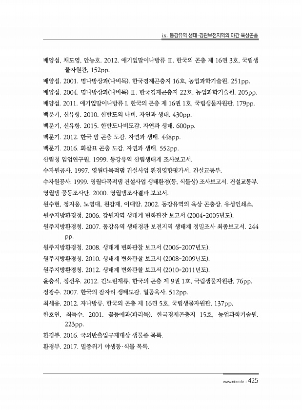ix. 동강유역 생태·경관보전지역의 야간 육상곤충 www.nie.re.kr ?425 배양섭, 채도영, 안능호. 2012. 애기잎말이나방류 Ⅱ. 한국의 곤충 제 16권 3호, 국립생 물자원관, 152pp. 배양섭. 2001. 명나방상과 나비목 한국경제곤충지 16호, 농업과학기술원. 251pp. 배양섭. 2004. 명나방상과 나비목 Ⅱ. 한국경제곤충지 22호, 농업과학기술원. 205pp. 배양섭. 2011. 애기잎말이나방류 I. 한국의 곤충 제 16권 1호, 국립생물자원관. 179pp. 백문기, 신유항. 2010. 한반도의 나비. 자연과 생태. 430pp. 백문기, 신유항. 2015. 한반도나비도감. 자연과 생태. 600pp. 백문기. 2012. 한국 밤 곤충 도감. 자연과 생태. 448pp. 백문기. 2016...