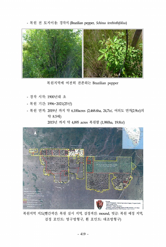 복원 전 토지이용경작지 Brazilian pepper, Schinus terebinthifolius 복원지역에 여전히 잔존하는 Brazilian pepper 경작 시작1900년대 초 복원 기간19962021 25년 복원 면적2019년 까지 약 6,100acres 2,468.6ha, 24,7㎢, 여의도 면적 2.9㎢ 의 약 8.5배 2015년 까지 약 4,895 acres 복원함 1,980ha, 19.8㎢ 복원지역 지도 빨간색선복원 실시 지역, 검정색선mound, 빗금복원 예정 지역, 검정 포인트영구방형구, 흰 포인트대조방형구 419