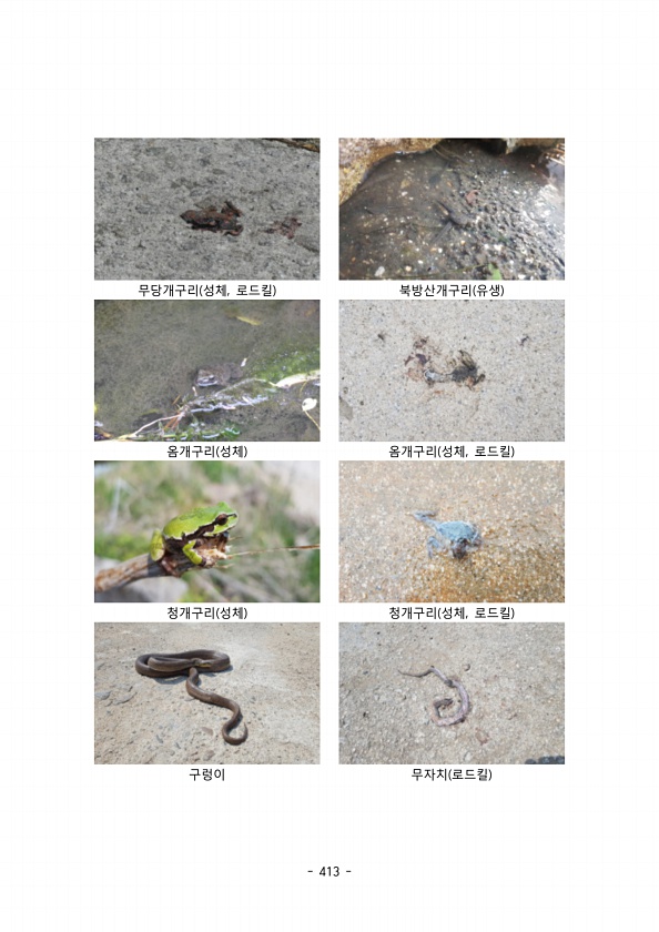 413 무당개구리 성체 로드킬 , 북방산개구리 유생 옴개구리 성체 옴개구리 성체 로드킬 , 청개구리 성체 청개구리 성체 로드킬 , 구렁이 무자치 로드킬