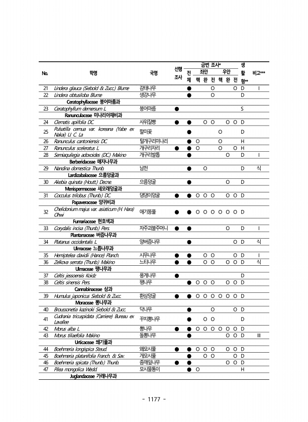 1177 No. 학명 국명 선행 조사 금번 조사* 생 활 형 ** 전 비고*** 체 좌안 우안 핵 완 전 핵 완 전 21 Lindera glauca Siebold & Zucc. Blume 감태나무 ● O O D I 22 Lindera obtusiloba Blume 생강나무 ● O D Ceratophyllaceae 붕어마름과 23 Ceratophyllum demersum L. 붕어마름 ● S Ranunculaceae 미나리아재비과 24 Clematis apiifolia DC. 사위질빵 ● ● O O O O D 25 Pulsatilla cernua var. koreana Yabe ex Nakai U. C. La 할미꽃 ● O D 26 Ranunculus cantoniensis DC. 털개구리미나리 ● O O H...