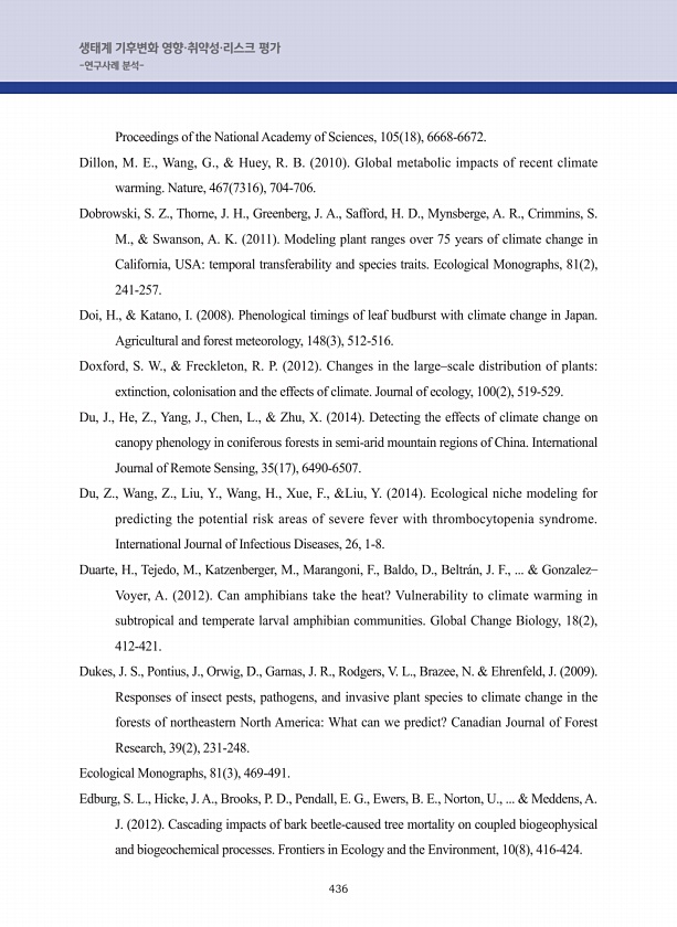 436 생태계 기후변화 영향·취약성·리스크 평가 -연구사례 분석- Proceedings of the National Academy of Sciences, 105 18 , 6668-6672. Dillon, M. E., Wang, G., & Huey, R. B. 2010 Global metabolic impacts of recent climate warming. Nature, 467 7316 , 704-706. Dobrowski, S. Z., Thorne, J. H., Greenberg, J. A., Safford, H. D., Mynsberge, A. R., Crimmins, S. M., & Swanson, A. K. 2011 Modeling plant ranges over 75 years of climate...