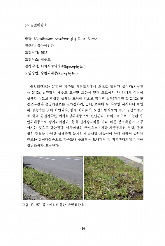 9 솔잎해란초 학명Nuttallanthus canadensis L. D. A. Sutton 원산지북아메리카 도입시기2013 도입장소제주도 정착양식이차식생외래종 Epecophyten 도입방법수반외래종 Kenophyten 솔잎해란초는 2011년 제주도 서귀포시에서 최초로 발견된 종이다 지성진 등 2012 발견당시 제주도 표선면 토산이 일대 도로에서 약 만개체 이상이 생육할 정도로 왕성한 생육을 보이는 것으로 밝혀져 있다 지성진 등 2012 현 장조사결과 솔잎해란초는 길가장자리, 공터, 초지대 등 다양한 서식처에 침입 해 생육하는 것이 확인되다. 현재 이차초지, 노상노방식생의 주요 구성수종으 로 국내 완전정착한 이차식생외래종으로 판단된다. 비의도적으로 도입된 수 반외래종으로 평가되어진다. 현재 길가장자리를 따라 ...