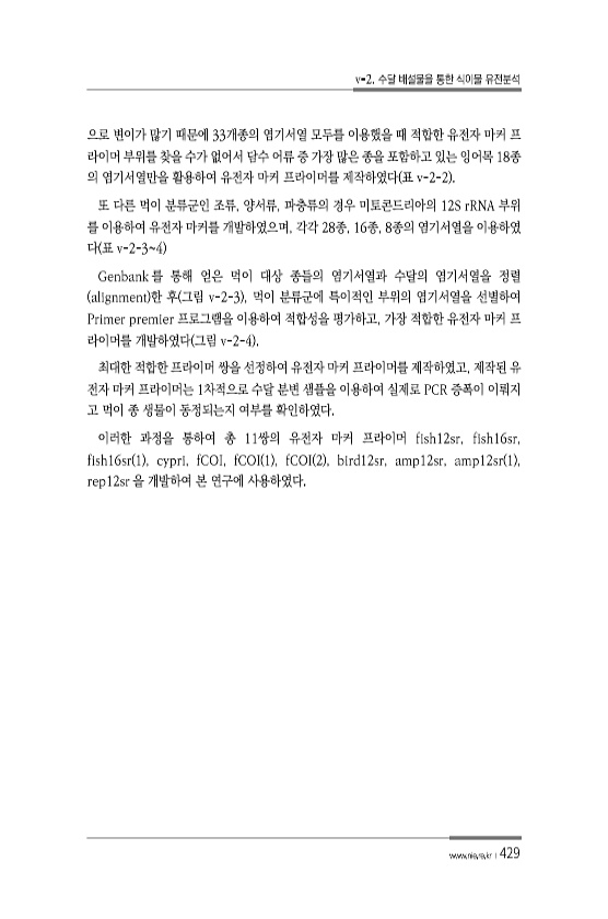 v-2. 수달 배설물을 통한 식이물 유전분석 www.nie.re.kr ?429 으로 변이가 많기 때문에 33개종의 염기서열 모두를 이용했을 때 적합한 유전자 마커 프 라이머 부위를 찾을 수가 없어서 담수 어류 중 가장 많은 종을 포함하고 있는 잉어목 18종 의 염기서열만을 활용하여 유전자 마커 프라이머를 제작하였다 표 v-2-2 또 다른 먹이 분류군인 조류, 양서류, 파충류의 경우 미토콘드리아의 12S rRNA 부위 를 이용하여 유전자 마커를 개발하였으며, 각각 28종, 16종, 8종의 염기서열을 이용하였 다 표 v-2-34 Genbank 를 통해 얻은 먹이 대상 종들의 염기서열과 수달의 염기서열을 정렬 alignment 한 후 그림 v-2-3 , 먹이 분류군에 특이적인 부위의 염기서열을 선별하여 Prime...