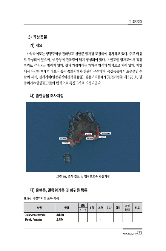 II. 조사결과 www.nie.re.kr ?423 5 바람막이도는 행정구역상 전라남도 신안군 임자면 도찬리에 위치하고 있다. 주로 바위 로 구성되어 있으며, 섬 중앙에 관목림이 넓게 형성되어 있다. 유인도인 임자도에서 직선 거리로 약 500m 떨어져 있다. 섬의 가장자리는 가파른 암석과 암벽으로 되어 있다. 지형 에서 다양한 형태의 타포니 등의 풍화지형과 경관이 우수하며, 육상동물에서 포유류인 수 달의 서식, 섬개개비 멸종위기야생생물Ⅱ급 , 검은머리물떼새 천연기념물 제 326 호, 멸 종위기야생생물Ⅱ급 의 번식으로 특정도서로 지정되었다. 그림 86. 조사 경로 및 법정보호종 관찰지점 , 학명 국명 문헌 1 차 2 차 3 차 합계 서식 1 2 형태 비고 Order Anseriformes 기러기목 Family ...