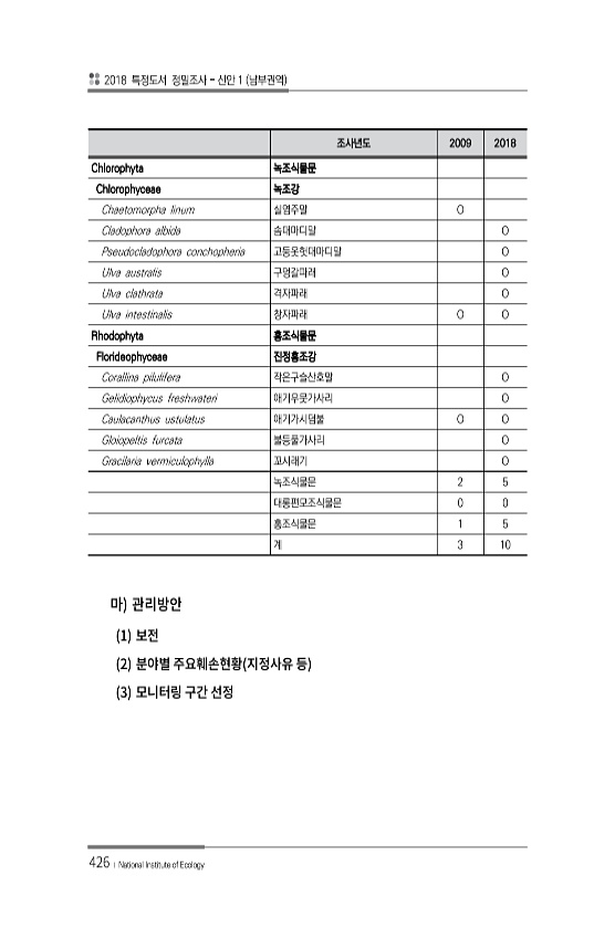 2018 특정도서 정밀조사 신안 1 남부권역 426 ? National Institute of Ecology 조사년도 2009 2018 Chlorophyta 녹조식물문 Chlorophyceae 녹조강 Chaetomorpha linum 실염주말 O Cladophora albida 솜대마디말 O Pseudocladophora conchopheria 고둥옷헛대마디말 O Ulva australis 구멍갈파래 O Ulva clathrata 격자파래 O Ulva intestinalis 창자파래 O O Rhodophyta 홍조식물문 Florideophyceae 진정홍조강 Corallina pilulifera 작은구슬산호말 O Gelidiophycus freshwateri 애기우뭇가사리 O Caulacanthus ustu...