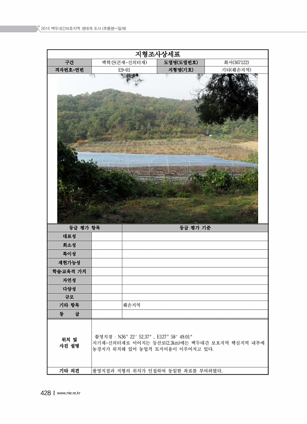 2016 백두대간보호지역 생태계 조사 추풍령밀재 428Ⅰwww.nie.re.kr 지형조사상세표 구간 백학산 큰재-신의터재 도엽명 도엽번호 화서 367122 격자번호-연번 E9-01 지형명 기호 기타 훼손지역 등급 평가 항목 등급 평가 기준 대표성 희소성 특이성 재현가능성 학술?교육적 가치 자연성 다양성 규모 기타 항목 훼손지역 등 급 위치 및 사진 설명 촬영지점 N36° 22′ 52.37″ , E127° 58′ 49.01″ 지기재-신의터재로 이어지는 등산로 2.3km 에는 백두대간 보호지역 핵심지역 내부에 농경지가 위치해 있어 농업적 토지이용이 이루어지고 있다. 기타 의견 촬영지점과 지형의 위치가 인접하여 동일한 좌표를부여하였다.