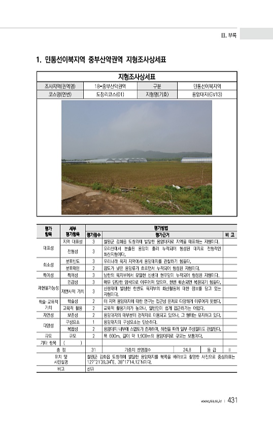 Ⅲ. 부록 www.nie.re.kr ? 431 1. 민통선이북지역 중부산악권역 지형조사상세표 지형조사상세표 조사지역 권역명 18-중부산악권역 구분 민통선이북지역 코스명 연번 도창리코스 01 지형명 기호 용암대지 GV13 평가 항목 세부 평가항목 평가방법 평가점수 평가근거 비 고 대표성 지역 대표성 3 철원군 김화읍 도창리에 발달한 용암대지로 지역을 대표하는 지형이다. 전형성 3 오리산에서 분출된 용암이 흘러 누적되어 형성된 대지로 전형적인 화산지형이다. 희소성 분포빈도 3 우리나라 육지 지역에서 용암대지를 관찰하기 힘들다. 분포패턴 2 점도가 낮은 용암류가 흐르면서 누적되어 형성된 지형이다. 특이성 특이성 3 남한의 육지부에서 유일한 신생대 현무암이 누적되어 형성된 지형이다. 재현불가능성 민감성 3 매우 단...