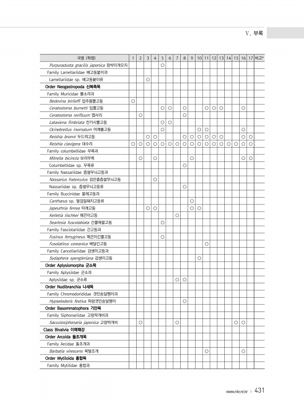 Ⅴ. 부록 www.nie.re.kr ? 431 국명 학명 1 2 3 4 5 6 7 8 9 10 11 12 13 14 15 16 17 비고* Purpuradusta gracilis japonica 점박이개오지 ○ Family Lamellariidae 배고둥붙이과 Lamellariidae sp. 배고둥붙이류 ○ Order Neogastropoda 신복족목 Family Muricidae 뿔소라과 Bedevina birileffi 입주름뿔고둥 ○ Ceratostoma burnetti 입뿔고둥 ○ ○ ○ ○ ○ ○ ○ Ceratostoma rorifluum 맵사리 ○ ○ Lataxiena fimbriata 잔가시뿔고둥 ○ ○ Ocinebrellus inornatum 어깨뿔고둥 ○ ○ ○ ○ Reishia bronni...