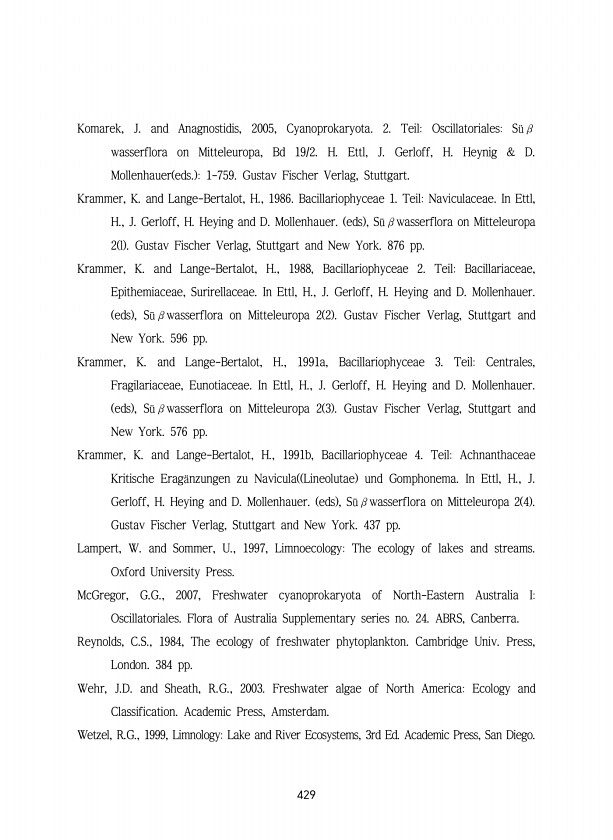429 Komarek, J. and Anagnostidis, 2005, Cyanoprokaryota. 2. TeilOscillatorialesS?β wasserflora on Mitteleuropa, Bd 19/2. H. Ettl, J. Gerloff, H. Heynig & D. Mollenhauer eds. 1-759. Gustav Fischer Verlag, Stuttgart. Krammer, K. and Lange-Bertalot, H., 1986. Bacillariophyceae 1. TeilNaviculaceae. In Ettl, H., J. Gerloff, H. Heying and D. Mollenhauer. eds , S?βwasserflora on Mitteleuropa 2 l Gustav F...