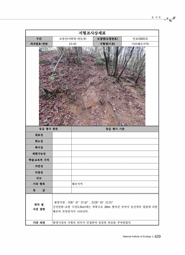Ⅲ. 부 록 National Institute of EcologyⅠ429 지형조사상세표 구간 조령산 이화령-하늘재 도엽명 도엽번호 안보 368013 격자번호-연번 E5-03 지형명 기호 기타 훼손지역 등급 평가 항목 등급 평가 기준 대표성 희소성 특이성 재현가능성 학술?교육적 가치 자연성 다양성 규모 기타 항목 훼손지역 등 급 위치 및 사진 설명 촬영지점 N36° 47′ 57.42″ , E128° 03′ 21.55″ 신선암봉조령 구간 1.9km 에는 북쪽으로 280m 떨어진 곳까지 등산객의 답압에 의한 훼손과 토양침식이 나타난다. 기타 의견 촬영지점과 지형의 위치가 인접하여 동일한 좌표를부여하였다.